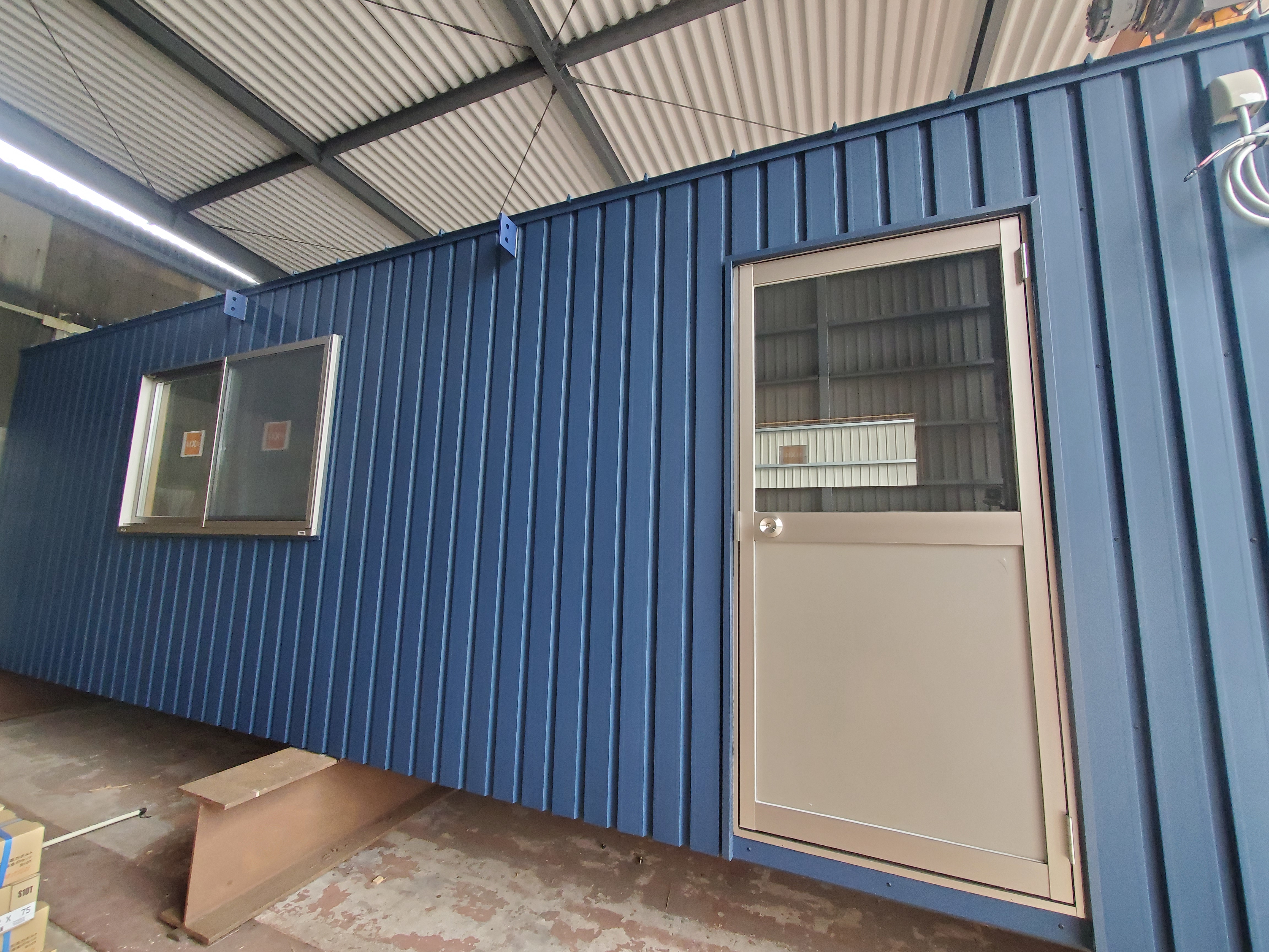2個連結 事務所 基本仕様 2個 1,000,000円×2 窓変更 2重ガラスFIX窓 追加2個 80,000円×2 窓2重ガラスに変更 20,000円 網戸追加 10,000円 断熱 100,000円 床フローリングに変更 150,000円 ドア、窓1カ所ずつ減 ー40000円 参考価格 合計 2,400,000 円+税 ※実際の施工例ですが他のオプション分は掲載しておりません